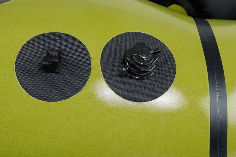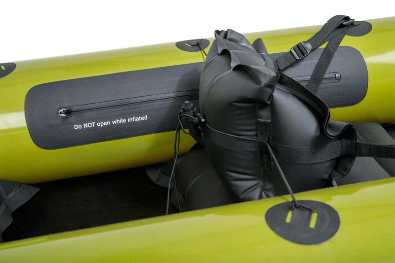Das Anfibio Sigma TXL ist zudem standardmäßig mit extra großen Anfibio TubeBags ausgestattet. Das sind zwei zentral positionierte, IPX7-wasserdichte Gepäckreißverschlüsse mit direkt hinterlegten, luftdichten Innentaschen (je 100 l). Das jeweilige Gepäckfach und die Hauptluftkammer bilden somit zwei voneinander getrennte Lufträume. Die Reißverschlüsse müssen für ihre Aufgabe nicht luftdicht sein, da das konstruktionsbedingt nicht notwendig ist. Selbst leicht (!) geöffnet erhält das System seine Funktion. Das macht es sehr resistent gegenüber Schmutz und Verschleiß: