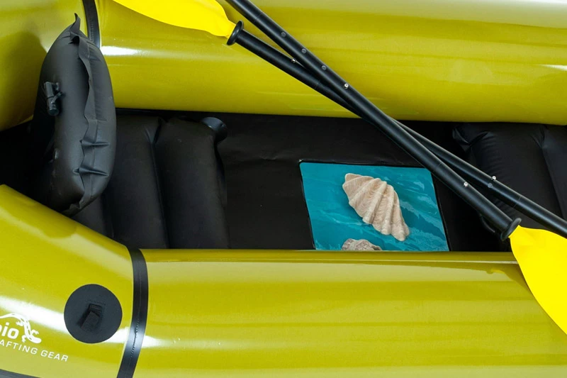 Vor dem hinteren Sitz liegt direkt ein 30x30cm großes in den Boden des Packrafts integriertes Sichtfenster, so dass man auch während der Fahrt an den Beinen vorbei ins Wasser schauen kann. Auch bei Verwendung des zweiten Sitzes in oder gegen die Fahrtrichtung bleibt der Blick in die Unterwasserwelt erhalten und wird nicht durch den zweiten Sitz verdeckt.Damit lässt sich die Unterwasserwelt während des Paddelns entdecken.
