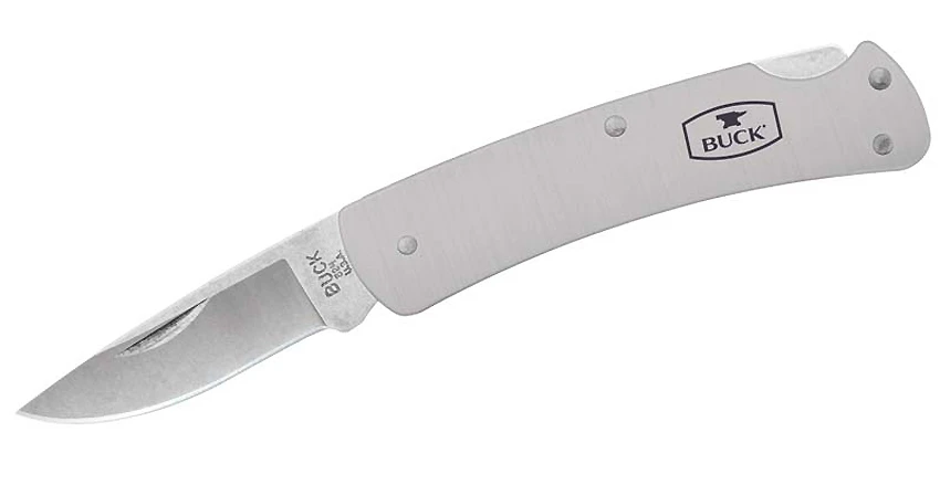 Ein vollwertiges Taschenmesser, mit der bei Buck üblichen hohlgeschliffenen Klinge aus vollwertigem 420HC Messerstahl. Die Kleinheit und das Material der Griffschalen – Alu- machen das Messer so leicht, dass man glatt vergessen kann, es dabei zu haben.