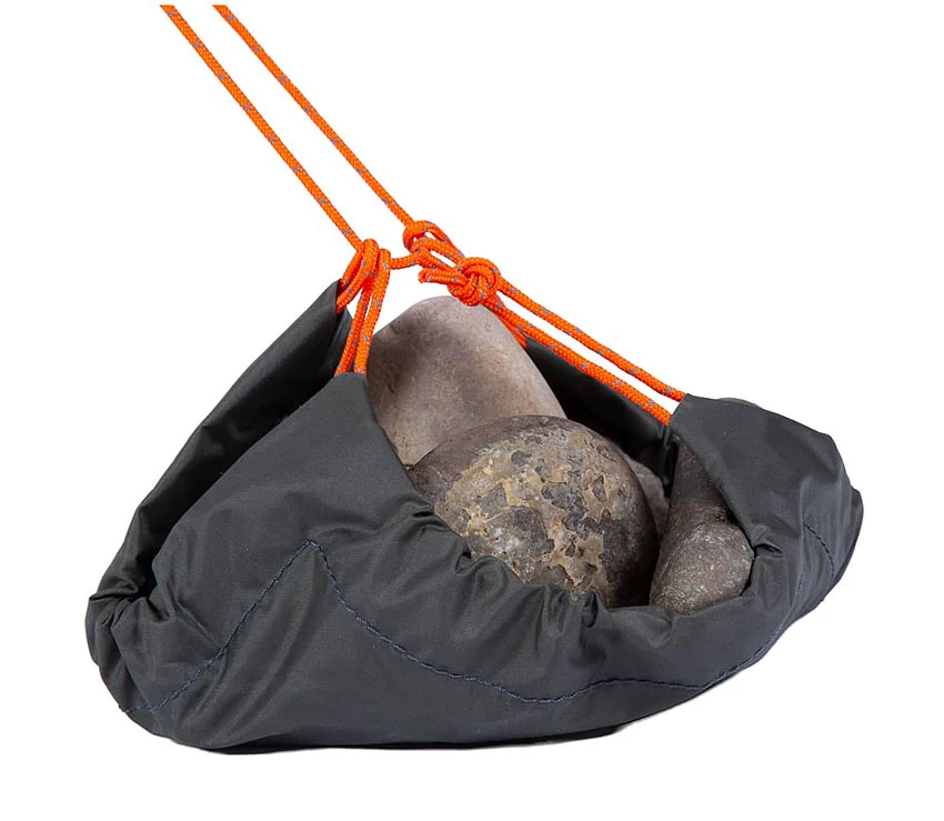 Der Anker wird mit Sand, Steinen oder Schnee gefüllt und anschliessend vergraben. Er besteht aus robustem Taffetanylon und ist dadurch nicht nur leicht, sondern auch extrem klein verpackbar.