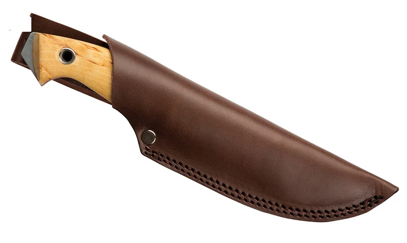 - Leder-Köcherscheide im Lieferumfang, aus kräftigem Leder, sehr gut passend, daher sitzt das Messer auch sicher trotz offener Form