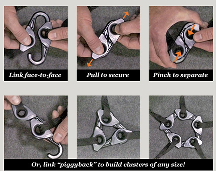- mehrere Gurte sind auch zu Ketten, Vierpunkt-System oder Netzen fest zu verbinden