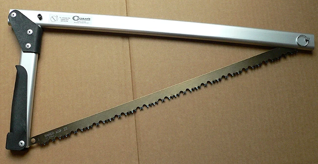 - Sägeblatt wird bei Transport im Alurahmen aufbewahrt, es können auch mehrere Blätter im Rahmen verstaut werden, praktisch bei längerem Wildnisaufenthalt, oder Bedarf unterwegs an verschiedenen Blättern