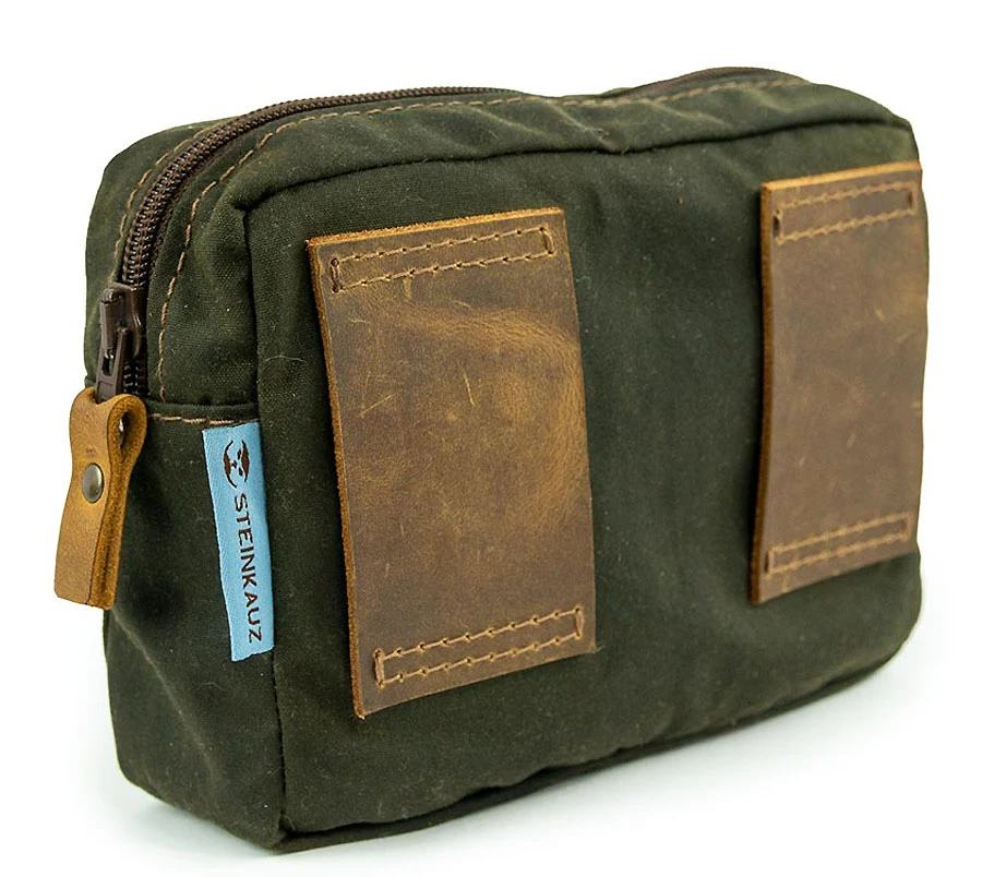 Gürteltaschen, die Kleinteile aufnehmen können und am Gürtel oder an Rucksack-Kompressionsgurten getragen werden, haben wir einige im Programm. Diese hier sind ungewöhnlich, da aus gewachster Baumwolle.