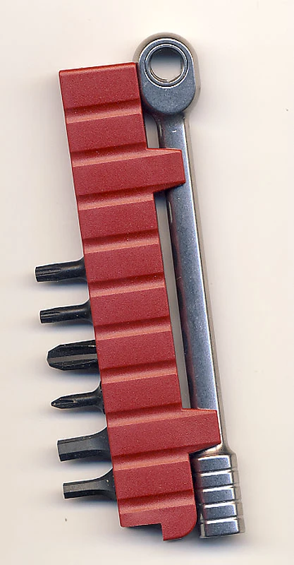Ein Ratschenset mit Bithalter und 6 der gängigsten Bit-Einsätze im roten Kunststoffhalter. Kann natürlich mit individuellen Bits bestückt werden, bietet insgesamt Platz für 10 Bits.